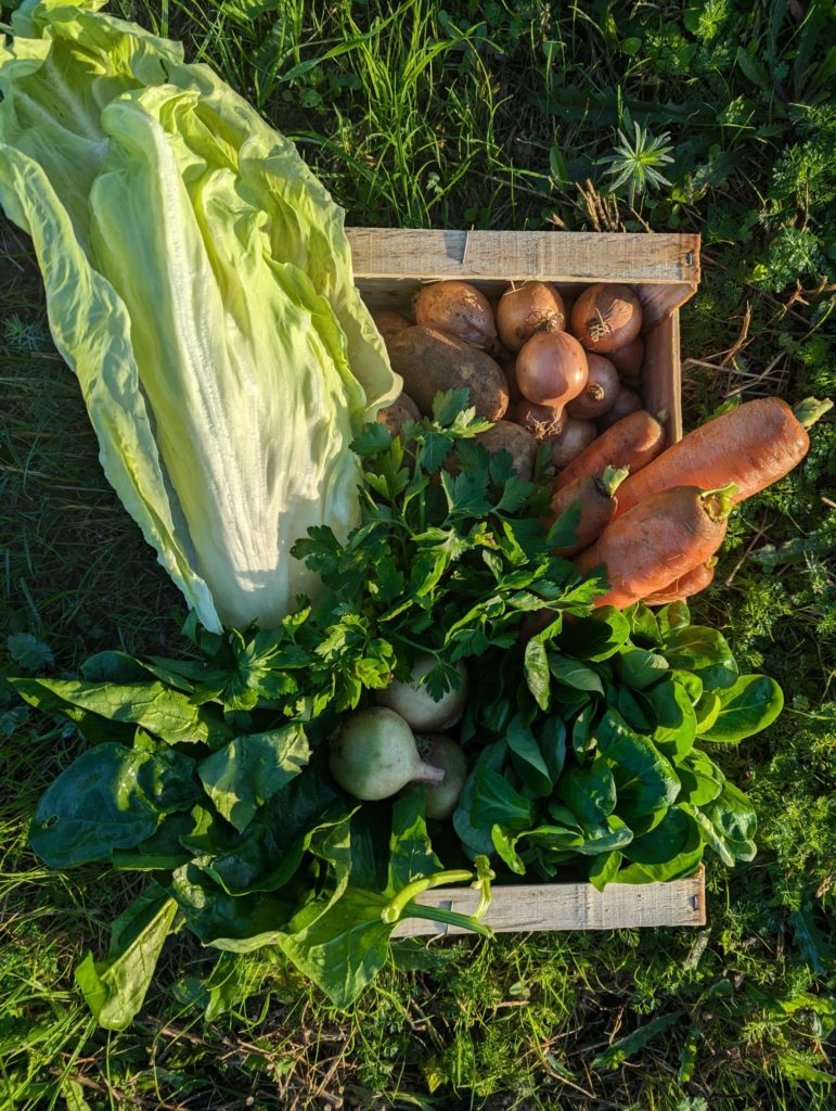 En fonction des récoltes et de la météo, le panier peut être modifié au dernier moment. Les légumes sont certifiés agriculture biologique et proviennent de la ferme de Gérald Céleste et Romain Jerger : Aux Légumes Célestes à Férolles (45).