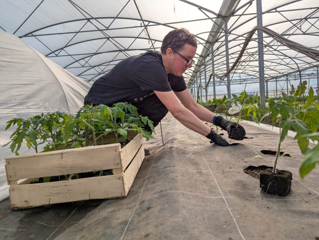 « Cette semaine à la ferme, nous profitons des journées radieuses annoncées pour planter les premiers pieds de tomates. Espérons qu’ils nous offriront de belles tomates bien rouges dès le début de la saison ! D’autres plantations suivront au fil des semaines.