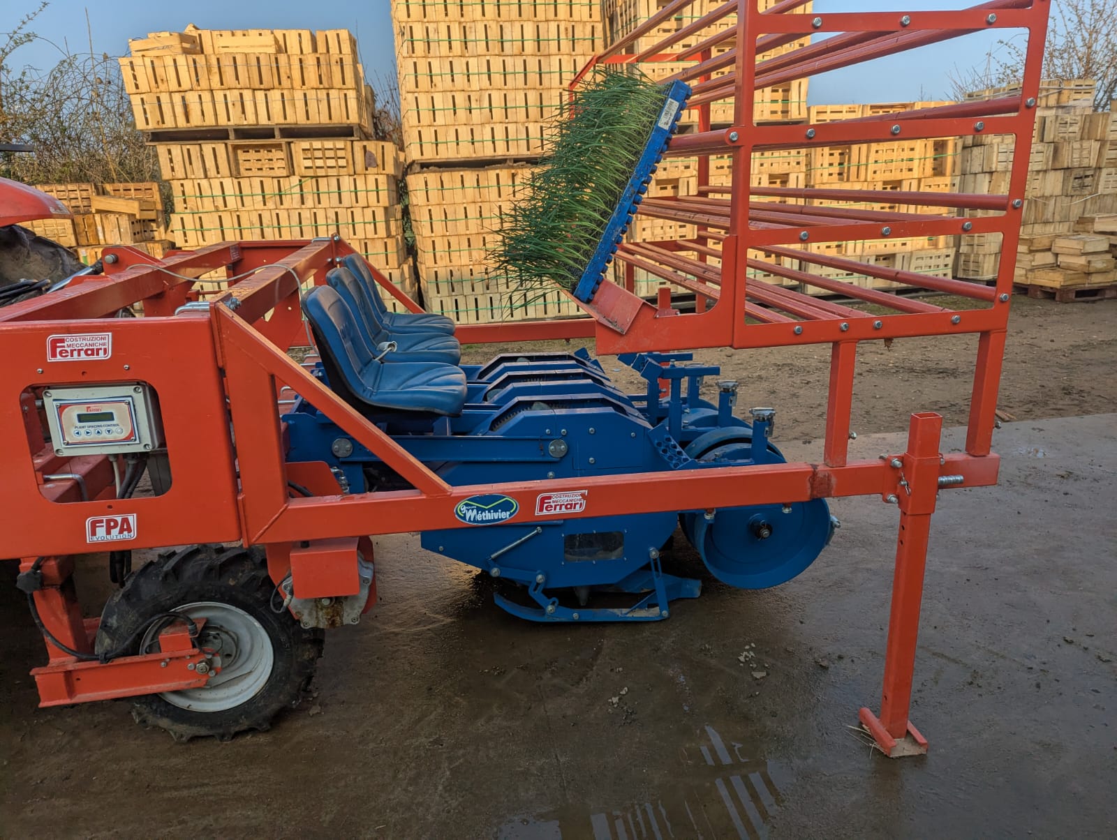 Nous devions débuter la plantation des poireaux, mais en raison d’un retard de livraison, celle-ci commencera finalement cette semaine. Vous pouvez apercevoir sur les photos ci-dessous, les plants de poireau ainsi que l’installation du poste de travail sur l’attelage de plantation. »