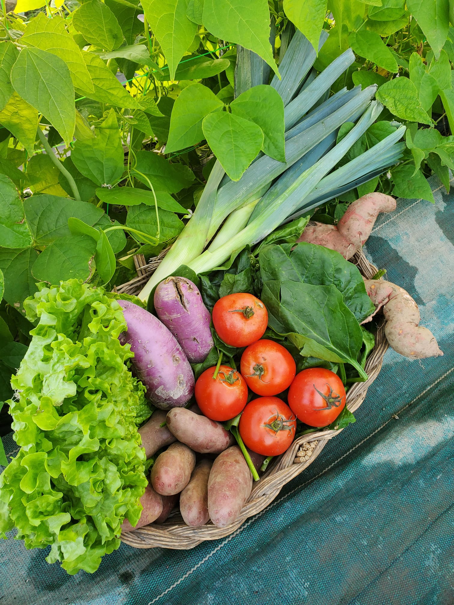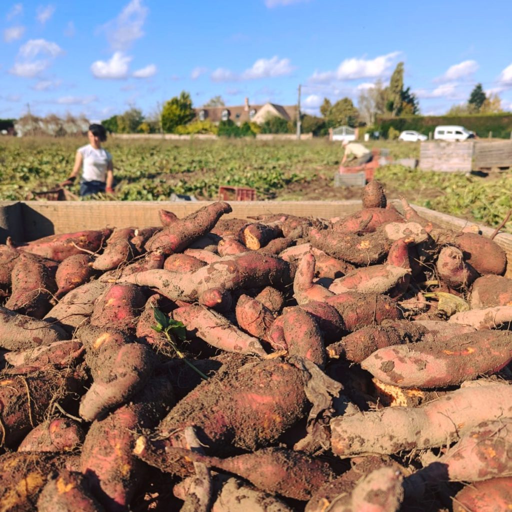 | Cette semaine, la petite nouvelle, c’est la patate douce : longtemps considérée comme un légume exotique, la patate douce se cultive désormais aussi sous nos latitudes. Après avoir débuté sa culture exclusivement sous serre, nous la plantons depuis 4 ans en plein champ et elle s’y plaît très bien ! Une belle récolte se profile cette année : vous allez pouvoir vous régaler de sa belle chair fondante, sucrée et orangée. |