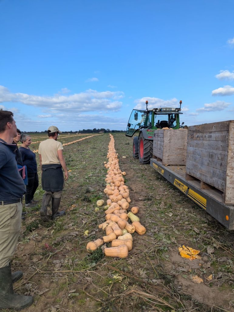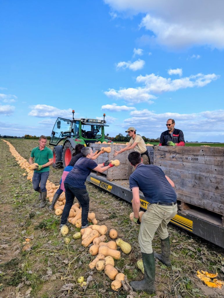 | La semaine dernière, nous sommes allés prêter main forte à nos voisins agriculteurs Hervé, Michelle et Clément Aribaud de la « ferme de la Pharmacie ». Nos 2 fermes sont très proches et ils nous aident régulièrement pour les travaux dans les champs. Il s’agit d’une ferme en polyculture-élevage, en agriculture biologique. Et une de leur multiple production est la culture de courges butternut destinées à l’industrie (babyfood ou soupes). Ils n’avaient pas assez de bras pour ramasser les 90 tonnes de butternut et nous avons été ravis de participer à ce chantier collectif et sportif ! |