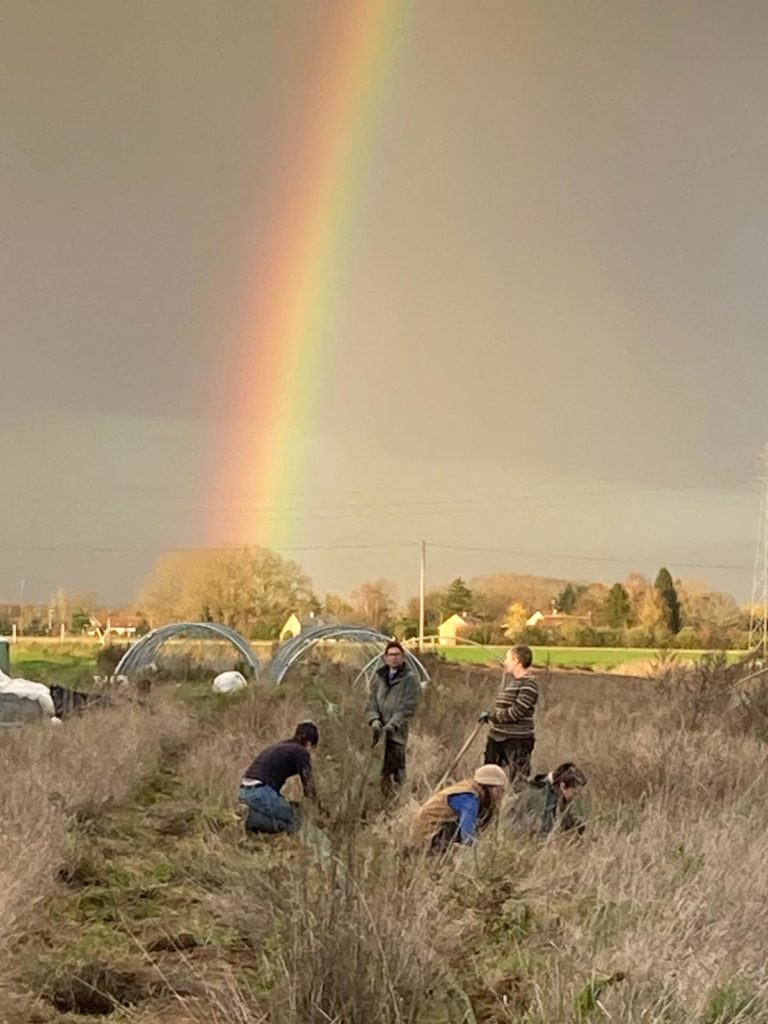 | Drôle de météo à la ferme cette semaine : après une magnifique lumière et un bel arc-en-ciel en fin de journée lundi, les premières gelées sont arrivées mardi matin. Heureusement, les légumes les plus frileux sont sous serres et/ou protégés par des voiles. En ce moment, nous préparons la plantation des fraisiers pour la production du printemps. Nous installerons les nouveaux plants d’ici une quinzaine de jours. |